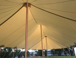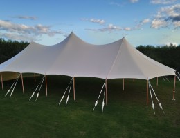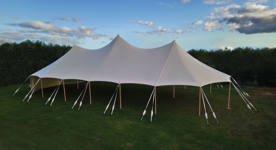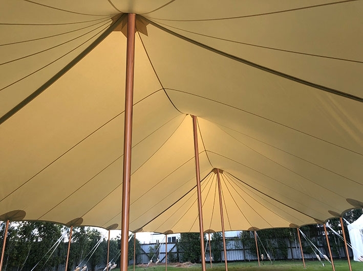 Our new Hampton pole marquee has the elegance of a traditional pole marquee with a point of difference- this marquee has champagne coloured fabric and wooden look poles.
